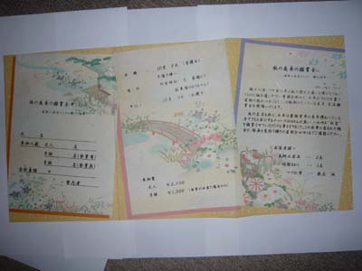 こんばんわ 以前にお知らせした「秋の夜長の観月会」の案内状が本日出来上がりました。今年はある有名な帯の織元にご協力いただき、いわゆる”社宝”である美術工芸品をお借りすることが決まっています。 が、物がものだけに全てに今までに無いほどの気を使って用意を進めています。(昨年も人間国宝をお借りしたので、当然気は使っているのですが・・・美術館に収めても良いほどのものである事を認識してから、人生において初めて胃が痛いという経験をしています・・・)と、いうわけで案内状も一工夫どころか、無い知恵を絞って、絞って・・・ がんばりました。(あくまで私なりに!ですが・・・)