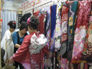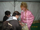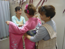 カメラやさんでは、一人の着付け師が、一時間に三人の出来上がりを目安に、合計四人の着付け師が奮闘しました。