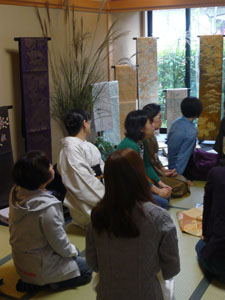 そして、説明が終わった後も、しっかり一つ一つを触って、確かめています。 「どうしてこんな風に見えるの?」「このさわり心地は何?」「えっ!色違いだとこんなに雰囲気が違うの?」「これはどんな着物に結ぶといいかな?」などなど・・・ 皆狭い教室で、本当に楽しそうでした。