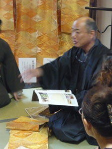 朝の10時を過ぎると、皆が続々とやってきました。 悩んだ末に、帰り道雨風がひどくなってもいいように、お洋服でこられた方が大半でしたが、着物を着てきてくださった方もいらっしゃいました。 「やっぱり着物、着ればよかった・・・」そんな嬉しい言葉も聞こえてきましたが、説明が始まると、皆がっちり勉強モードです。 どんどん質問が飛び、一点一点の説明を求められ、Wさん大変そうでした。が、もともと機屋の息子さん。そこで生活していないと知り得ない事も、沢山教えていただきました。驚く事いっぱいでしたね!