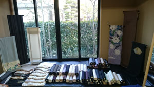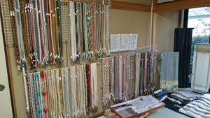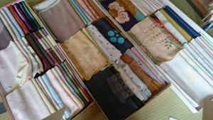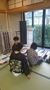 彩匠の展示会は、勉強をする場です。 京都へ出向いて、一点一点選品した物しか並びません。実際に手に取りそれぞれの手触りや、風合いを自分で感じます。そして、そこに注がれている職人さんの技術を学びます。物の価値にあった値段を知ることも、大切な勉強です。 さらに自分に似合うものがどういうものなのか、色や柄(絵柄だけではなく柄の大きさなども!)等学びます。 又、自分ではわかりにくいコーディネート(色合わせや、格合わせなども)の勉強も!! 沢山の商品があるからこそ出来る、貴重な時間です。