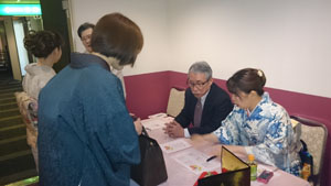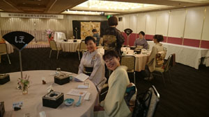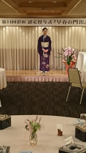 受付で迎えてもらった写真の生徒さんは、この日は「認定授与式」の司会者です。 来賓紹介の時「父親のようでもある・・・」と紹介していましたね。年齢も環境もばらばらの人たちが、「着物が好き」っていうたった一つの共通点で結ばれて、兄弟のように親子のようにそんな親しいお付き合いができるようになってゆく・・・そんな姿を改めて垣間見るそんな幸せな時でもあります。