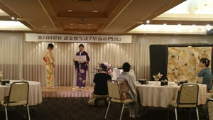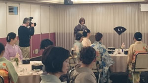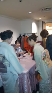 この後は、認定者による技術披露「2級認定者 礼装の着物の自装」「1級認定者 振袖の着せ付け」に続き、「講師認定者 講師のおけいこ風景(講師役は言葉で説明、生徒役は留袖を着る)」合計4名の方の実技を見せていただきました。