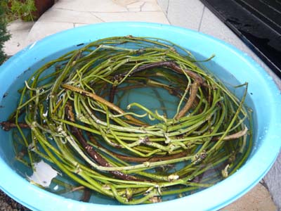 今年は蚕から糸を取り出してみたいと思っていたのですが、 タイミングが合わず・・・ (だって、蚕は生きてるから、タイミングが合わないと繭の中から成虫の大きな蛾とご対面になっちゃうんだもの・・・ それは正直怖いのです!! どこからか”考えがあまい!!”とお叱りの声が聞こえてきそうですが・・・) でも「自分で、繊維を取り出してみたい」との思いはおきらめきれず・・・ 「植物性ならやれるかも!」と思いつき挑戦してみようと用意してみたんです。