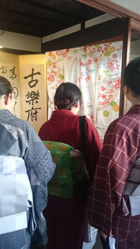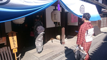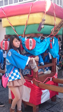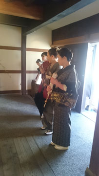 さてさて、歩き疲れた一行は・・・「のど乾いた~!!」とカフェに立ち寄り、のどを潤し、帰り道には、生の三味線演奏を聴いたり、当日は阿智神社のお祭りで、おみこしも出てましたし、可愛い「すいんきょ」さんに団扇で頭をポンポンしてもらったり・・・