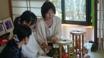 今年は帯締め(組紐)帯揚げの制作方法や図案についてまで、いつも彩匠がお世話になっている京都の小物屋メーカーにお願いして、帯締めについては組紐の職人さんにも来ていただき、普段からモノ作りをしている専務に講師役をお願いしました。
