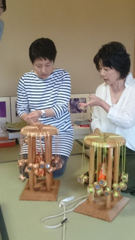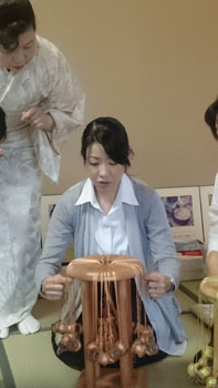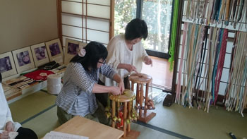 三回目 二日目の朝は 彩匠ではベテランさん広く深い知識を持った生徒さんと、比較的新しい生徒さんの組み合わせで、どうなる事かと思いましたが・・・新人さんたちの好奇心の強い事。 文字通りの「かぶりつき」。自分が納得できるまで引きません(笑) 自分の体験を終えても・・・ 写真の通りです。 この組だけでしたね。組紐の重りの袋の中に何が入っているのかまで開けて見せていただきました。 講師の方や職人さんも「本当に好きなんですね~!!」と驚いておられました。