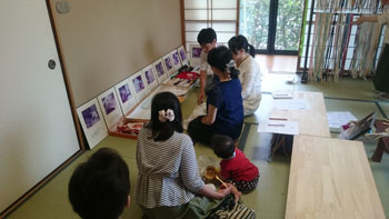 二回目の会は一番大人数・・・ 新人から古株まで、一人ひとり知識の深さや幅が違います。様々な道具を用いて、一人ひとりがしっかり理解できるように、丁寧に教えてくださいました。 あんまり多くて、写真を撮る間がない程・・・ 様々な疑問が飛び交いましたね。 人数が多くても、一人ひとりちゃんと組の体験はしていました。 実際にやってみないと糸の感触や重りの重さなど・・・見てるだけではわからないこと満載です。 型染めの帯揚げの制作方法について学ぶと「着物と一緒じゃん!そんなに手が込んでるんだ~」と感心しきりです。
