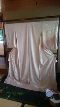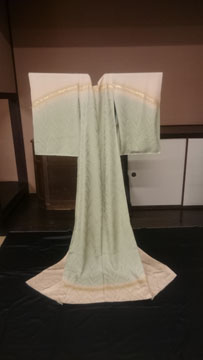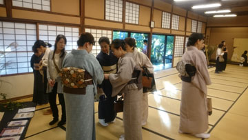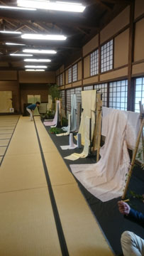 はい、今年は歓声が上がりましたね! あっという間に展示してあった着物や帯はそれぞれ狙っていた生徒さん達の手に!ほぼ参加者全員が、ほぼ全ての着物を羽おり、帯を当てて鏡の前に!! 「あ~!すごくよく似合う!」「うわーこんな色目も似合うんだ!」「私の方がよく似合う!」「それはよく似たの持ってるじゃん。」「この手触りすごい!」「こっちの手触りとは違うよ、又違う気持ちよさ!」エトセトラ・・・・・ 社長はあまりの事に圧倒されていましたね。中には「ここの色目で箔を抜いて、無地になるように別注お願いできたらうれしいな~。」なんて荒てな事を言い出す人まで! 本当に楽しい時間でしたね。 勿論着せて歩いている私には、写真を撮る時間はなく!! 私自身羽おってみる時間など勿論無く・・・