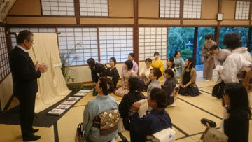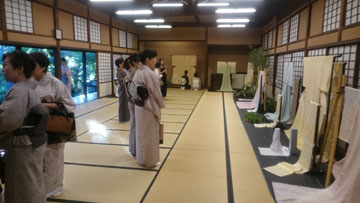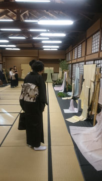 さて、去る10月10日(月曜日)彩匠恒例の「秋の夜長の観賞会」無事開催しました。 考えてみるとこの会も既に10回を超えています。 京都に出向いて行って沢山のモノを見せていただく機会の多い私と学院長。 その時に、それぞれの取引先で、社宝のような作品、職人の素晴らしい技術がてんこ盛り込められた作品、中には美術館入りしてもおかしくない様なモノも、キワキワの思いを込めて作った為に、二度と同じものは作れないので、人前に出すのを辞めているモノ・・・など本当に素晴らしいモノを見せていただくことが多々あります。 その時に「あ~生徒さん達にも見せてあげたい!!」と心底思います。 京都に出向いてくれれば見せてあげられるのですが、様々な事情を皆抱えているわけで、皆が京都に行けるわけではありません。 でも、でもそんな生徒さん達にも「見せてあげたい!!」 その思いから始まったのがこの「秋の夜長の観賞会」です。1年に1度だけ彩匠の教室を飛び出し、「新渓園」の50畳の会場をお借りして、普段見ることの出来ないものを、お願いしてお借りしてきて、展示させていただき勉強をします。
