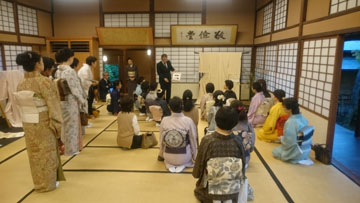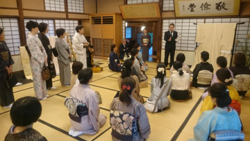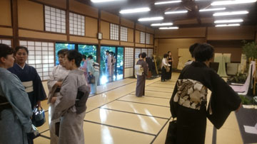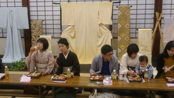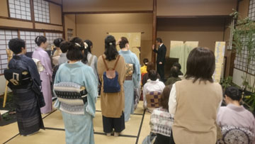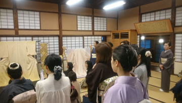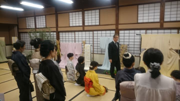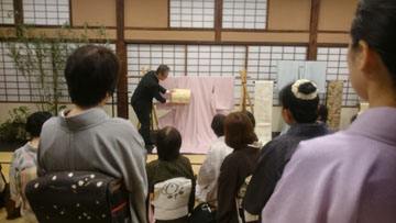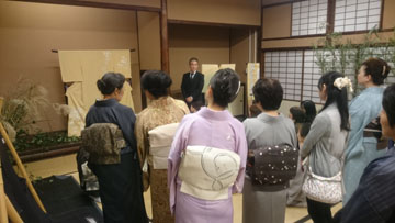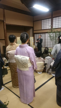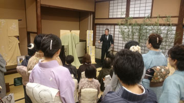 そして、説明開始の予定していた17時には・・・着物姿がいっぱい!! 説明が始まるのを待ち切れず、個人的に質問を始めていた人もチラホラ・・・ 今回は職人さん自身は来ていただくのは無理だったので、先代どうしから深いお付き合いのあるメーカー問屋の社長さんが来て下さり、作品一点一点を職人「北出与三郎」の人柄も交えながら、丁寧に楽しく、わかりやすく説明して下さいました。