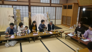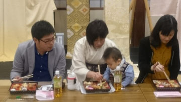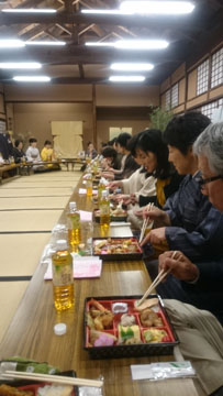 一生懸命勉強したら・・・おなかが減ります。 毎回「さくら弁当」さんにお願いしているお弁当を頂きます。 さくら弁当さんにもこの会の最初からお願いしています。 今ではメールで、「今年もお願いね!」なんてあまりにも簡単なお願の仕方をしていますが・・・毎年趣向を凝らして作ってくださり、こちらの都合にあわせて、配達までしてもらっています!! 実はこのお弁当もこの会の楽しみになっています。今年も美味しかったね~!! おなかもいっぱいになりましたよ。 今年は36名の多人数!! 会場の真ん中で、テーブルで輪を作り皆で互いの顔を見ながら同じお弁当を頂きます。勿論今日「はじめまして」の方もいますし、お子さんやご主人も一緒に参加して下さっている生徒さんも、さらには一ヶ月後に出産を控えた生徒さんや、病気の治療を頑張っている生徒さんも・・・ 皆誰とでも仲良くしてくれるので、暖かい空気ですし、さりげなく互いに気遣いを示しあっている様子が随所に・・・本当に助かりますし、嬉しくなってしまいます。