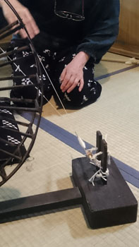 一見糸車をくるくる回しているように見える間に「繊維から糸を紡ぎだし」「紡ぎ出したものに撚りをかけ糸にする」「そして次の工程で使いやすいように糸を巻き取る」こんな複雑な工程をこなしているという事です。「糸の太さ」「糸の硬さ」「糸の均一さ」「糸の強さ」全てもこの工程で決まる! 人の感覚の凄さに圧倒されます。 そして、座布団の下には道具と一帯になっている板があった事に気付きましたかね。 それぞれの道具にちゃんとありますが、自然に自分の身体で道具を押さえ、動かないように作業しやすいように作られています。 先人の知恵の深さや繊細さに感動します。