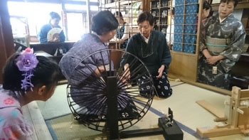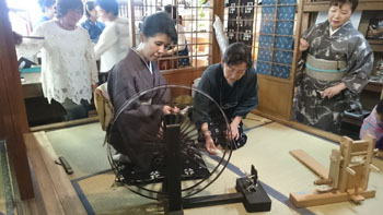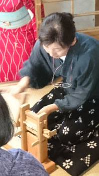 続いて体験させていただいたのは「糸紡ぎ」でした。 ハイ「糸車」です。 今回は私にとってもこれが一番の驚きと学びでした。 糸車の映像はきっと子供の時の国語の教科書に載っていた「タヌキの糸車」だと思います。 が、この糸車でどんな作業が行われているのか・・・全くわかっていませんでした。 「大きな糸車に糸が巻き取られているのかな・・・」なんてぼんやり思っていました。「よくそう言われるのよ~」と優しく笑いながら日名川先生が説明しながらみせて下さいました。