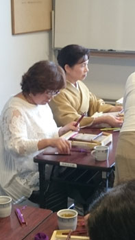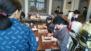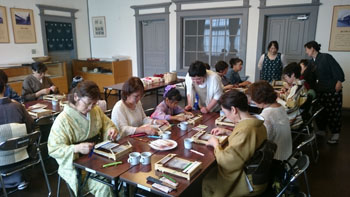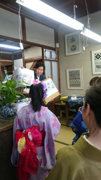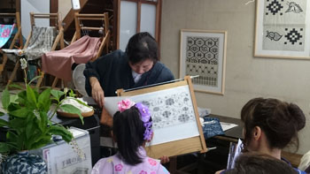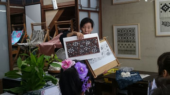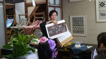 重たいお腹を抱えながら、いよいよ本日のメイン会場「作州絣工芸館」へ到着です。 暑い中講師をお願いしていた、「日名川茂美」先生が迎えに出て下さり、会場へ案内して下さいました。 昨年の5月にふっと思いついて寄ったこの作州絣工芸館。 忙しい日名川先生に偶然にもお会いでき、お話を聞く事が出来ました。 作州絣は残念なことに一度途絶えてしまった織り物です。 それを見事復活させたのが日名川先生です。 そんな日名川先生のお話を聞くうちに、どうしても直接うちの生徒さん達にお話をしていただきたくて・・・その場で一年以上先のお願いをして、日時も決めて帰ったんです。
