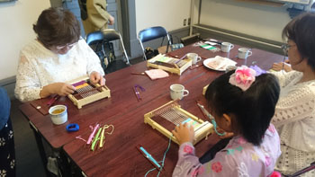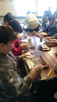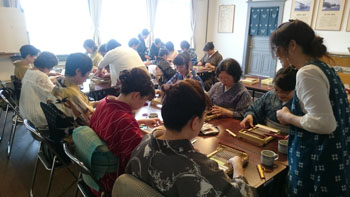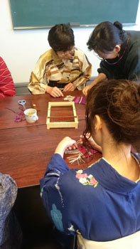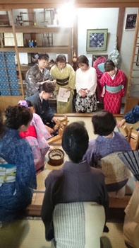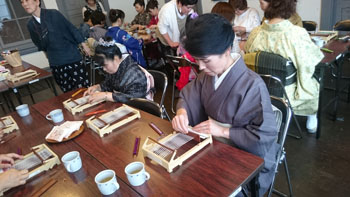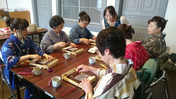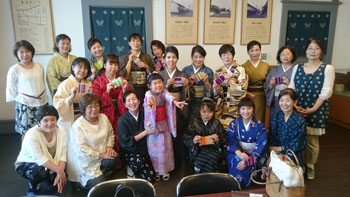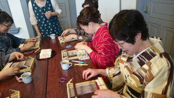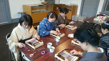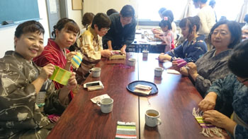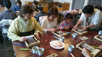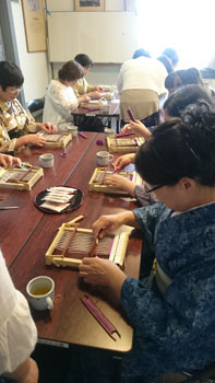 最後は少し場所を移動して、コースター作りです。 一人に一つ卓上の機織り機を用意していただき、好きな色の糸を選んで、黙々とコースターを織りあげます。皆本当に真剣です。一人一人打ち込みの強さが違うので織りあがるスピードはまちまちです。お嬢さんも一生懸命自分のセンスで糸の色を変えながら織っていました。 卓上の小さな機織り機ですが、機の構造はよくわかります。いい勉強になりましたね! 一人一人自分のデザインで、世界に一つだけのコースターの出来上がりです。 最後はお世話になった方皆さんと一緒に記念撮影をしました。日名川先生本当にお世話になりました。 楽しかった一日はあっという間に過ぎてしまいましたね。 参加者の皆さんを始め、旅行会社の方、バスの運転手さん ふれえばあの御夫婦、そして何より日名川先生を始め作州絣保存会の皆さま、本当にお世話になりました。 ありがとうございました。