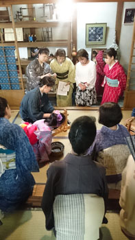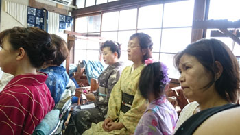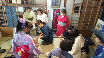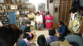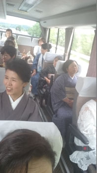 朝九時半に教室に集合して、バスに乗り込みました。 「うまく帯が結べてない!」とか、「着付け師さんチェックして~!」とかそれぞれが好きな事を云って集まってくる姿に、バスの運転手さんも笑っておられました。