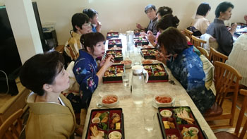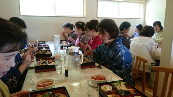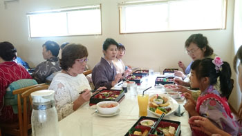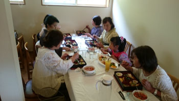 少し早目に着いたものの、気持ちよく涼しい店内に招き入れて下さり、まず目に入ったのが、魚の形の大皿に盛られた、可愛く美味しそうなお食事。「わあ!!」と歓声を上げたのは子供さんだけでは無かったですね。 大人の食事はお弁当形式。ふたが閉まっている為に中は見れません。 ただ、皆がふたを取るのをワクワクして待っていたのは間違いなかったですね(笑)おりの中の和洋折衷のお料理に加え、もう一皿・・・アツアツの鳥のトマトソース煮!? それだけでもお腹いっぱいなのに、更にデザートが出てきます。それもフレンチトーストにアイスクリームに果物!! 「あ~!食べきれない。」「もう今晩食事いらない!!」とか様々な言葉が飛び交っていましたが・・・美味しかった事は言うまでもありません。 女の子も「極楽~!!」なんて言って皆を笑わせていました。「ふれえばあ」さん 本当にありがとうございました。 お世話になりました!!