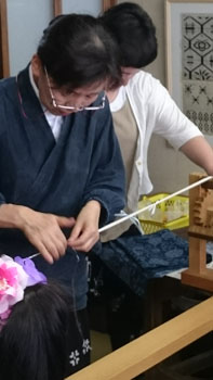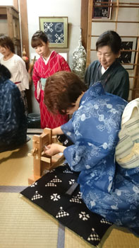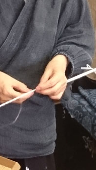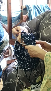 そして、作州絣の柄や絣を作る技法、作製工程なども、実物を見せていただきながら勉強させていただきました。 「ここまではお見せする事はないんですけど・・・技術盗まないでくださいね~」なんて冗談を交えながら、絣の柄を作るための糸の括りまでみせて下さいました。