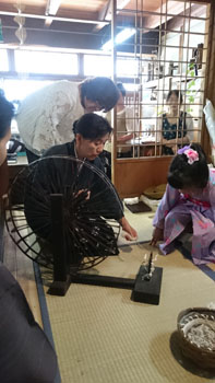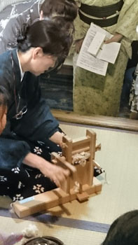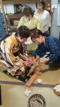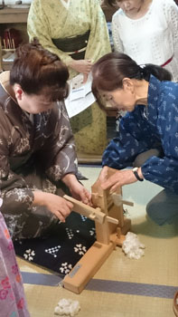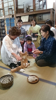 続いて、奥の間に移動して、「綿繰り」(綿の繊維と種を分ける)の体験をさせていただきました。 綿を見た事がある方は多いと思いますが、その種を取り出そうとすると・・・大切なものを全力で守っている事がよくわかります。 繊維にしっかりとくるまれていて、力任せに繊維を引っ張ってもなかなか種を取り分ける事は出来ないんです。 が、二本の木の棒でこすり取るような構造のこの道具を使うと、簡単に繊維と種を分ける事が出来ます。 私が初めてこの道具を見て、使い方を見せてもらった時の驚きは忘れる事はありませんし、見るたびに「すごいな~!!」と感心します。 皆も「えぇ~!!凄い!!」と言いながら体験してましたね。