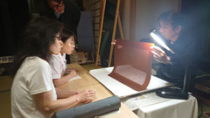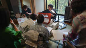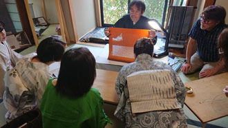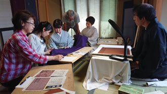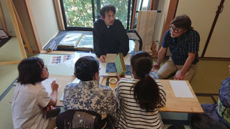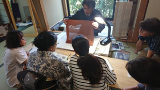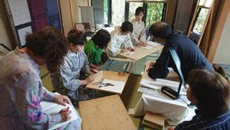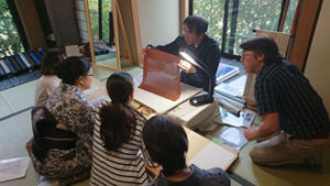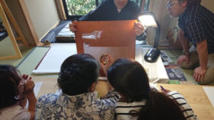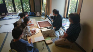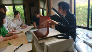 例年通りの勉強会。今年は伊勢型紙の人間国宝を中心に、江戸小紋の勉強会を開催しました。講師には京都の染めの老舗「古今」さんから玉村さんに来ていただき、更には、数年前惜しまれながら閉店した、大阪の老舗呉服店「まるさ」の社長ご夫妻から譲り受けた、貴重な彫刻刀や書籍を用いつつ、沢山の事を学ぶ事が出来ました。