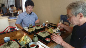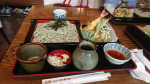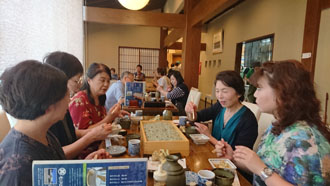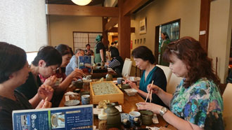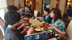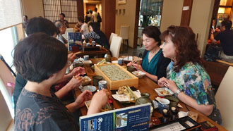 岡山から東京へ、東京で上越新幹線に乗り換えて「越後湯沢駅」へ お迎えのメンバーと合流し、早速名物「へぎそば」をいただきました。 彩匠のお出かけは、皆実費です。 「世の中タダより怖い物は無い!」当然実費。なので計画立てる時には、費用の計算は頭を悩ませる処です。が、今回参加のメンバーからは「御当地の美味しい物を食べる事」と「温泉に入る事」は必ずお願いします!と釘を刺されていました(笑) なので、まずは「へぎそば」を堪能です。 お昼を新潟で食べる為に、早目の新幹線で着たんですものね~。途中お腹が減った人も我慢して・・・ 布海苔を使って作られている為、普通のお蕎麦より緑がかった色で、つるつるしています。 やっぱり分量は多いんです。最後は目を白黒させながら頑張って食べていました。