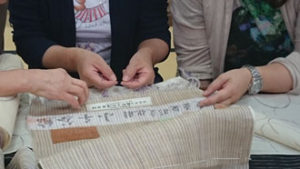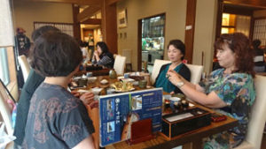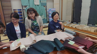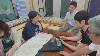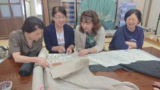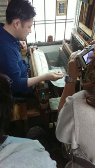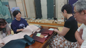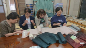 二日目の朝。 ゆっくり湯沢温泉につかった皆。「美人になったでしょ~!」と言い合いながら、まずはお世話になる老舗中の老舗の地方問屋さんへ。なかなか見る事出来ない物ばかり・・・その中でも彩匠のメンバーが真っ先に手に取るのは間違いなく最高級品!! 「流石ですよね~!お目が高い!!」と言われて・・・「目は肥えてます! とっても手は出ませんけど。」そしてここからが彩匠です。「手は出ませんが、触らせていただいてもいいですか?」「勿論どうぞ~!!」 と許可をいただき・・・その後は感嘆の嵐でしたね・・・