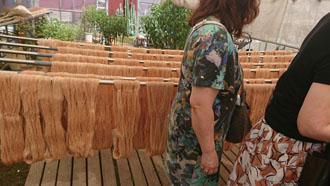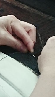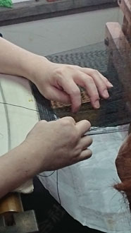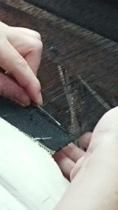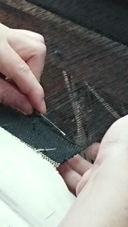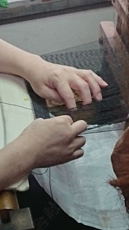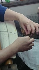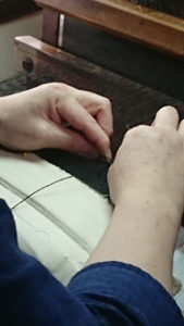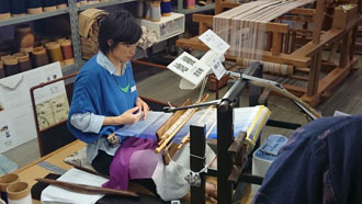 「開発した企業秘密の織り方は見せられませんけど・・・ 織りの様子見ますか?」と機場に案内して下さり、織りと言うより編みに近い実演を見せていただきました・・・ なんて繊細、緻密、根気のいる作業。