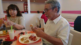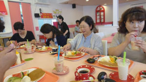 「美味しい物」「御当地の名物」さんざん食べてきた三日目の最後の食事・・・ 「何だか・・・ジャンクフードが食べたいかも・・・」「はあっ?」と言いながら担当者が「食事はした事無いんですけど・・・」と恐る恐る連れて行ってくれたのは・・・ 果物屋さんが経営しているお店・・・ ものすごく沢山の和洋中のメニューがありましたが・・・皆が大喜びして頼んだのは「パンケーキ」でした(笑) 見よ、この嬉しそうな顔!!